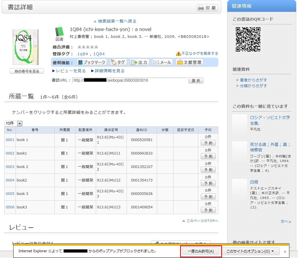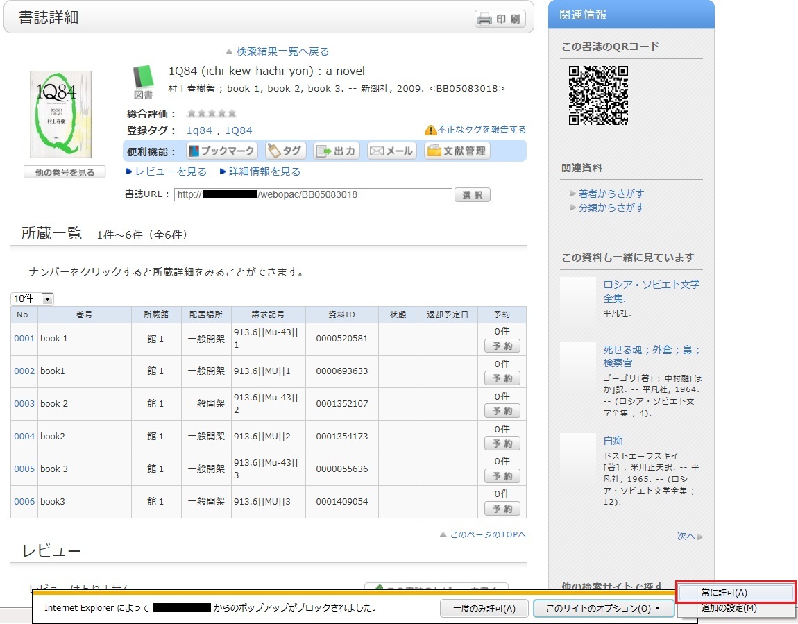 * ただし、この方法ではブラウザを一旦閉じてしまうと、再度ブラウザを立ち上げたときに、ポップアップブロックが有効となります。OPACで予約やILLなど何か申し込まれるときには、再度同じ操作が必要となります。