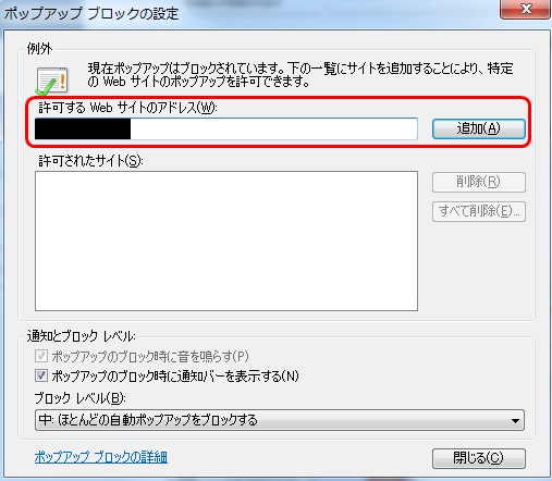 * 画面はInternet Explorer 9です。お使いのブラウザやバージョンによって、ポップアップブロックが表示される場所は異なりますので、詳細は各ブラウザのヘルプをご覧ください。