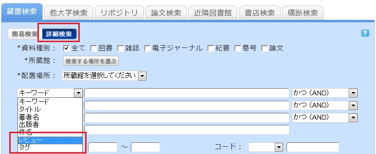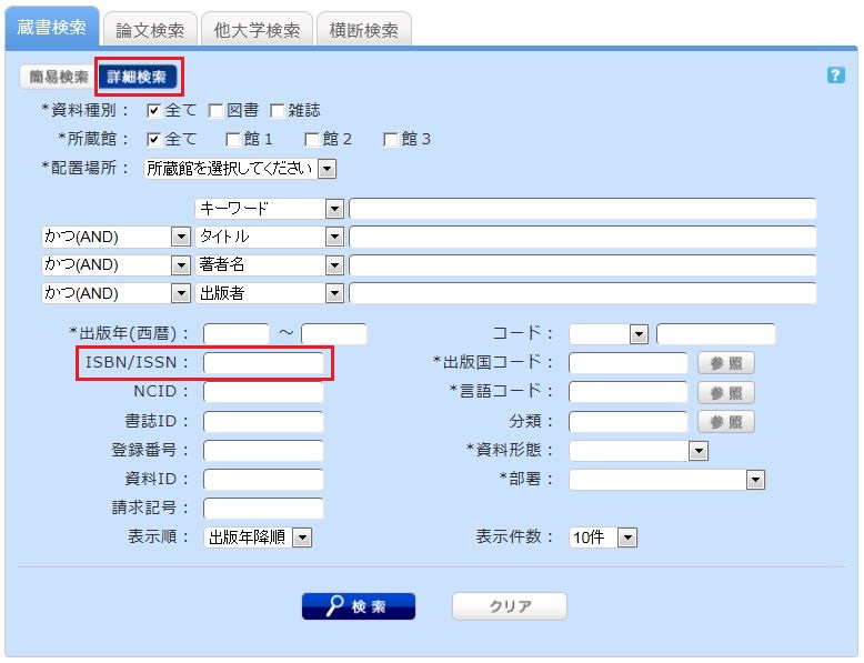 または、[蔵書検索]タブの[詳細検索]ボタンをクリックして、詳細検索画面から検索することもできます。
