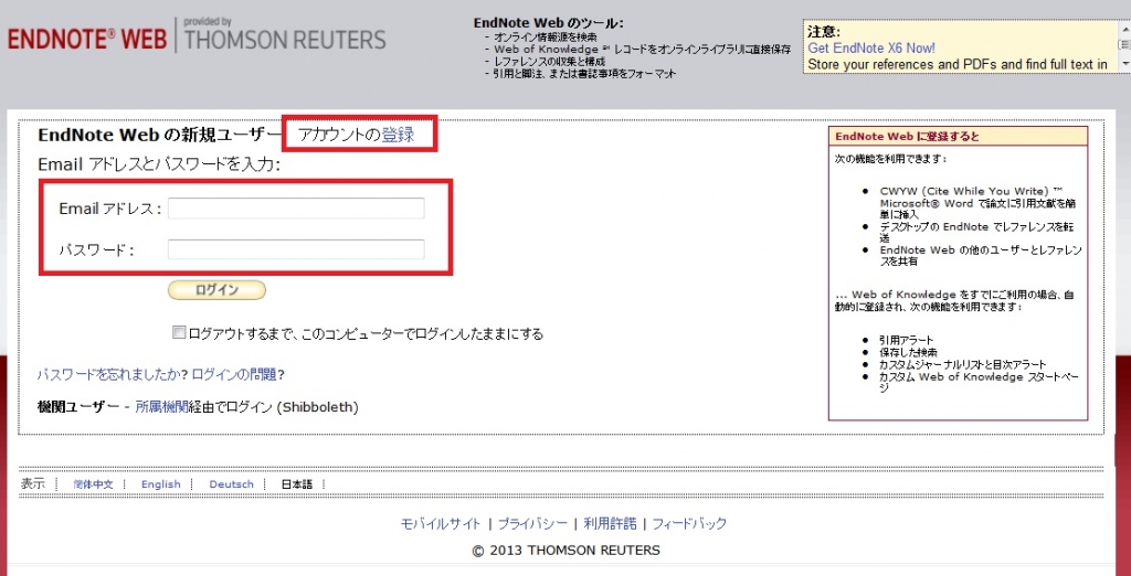 * EndNote のアカウントをお持ちでない方は、「アカウントの登録」からユーザ登録をしてください。