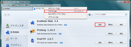 - Firefoxのメニュー [ツール] → [アドオン] → [拡張機能]で、EndNote Webの「設定」をクリックします。