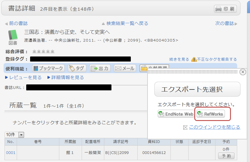 (書誌検索結果一覧では、取り込む書誌を選択する必要があります。) - 「エクスポート先選択」のポップアップが出てきたら、「RefWorks」を選択します。