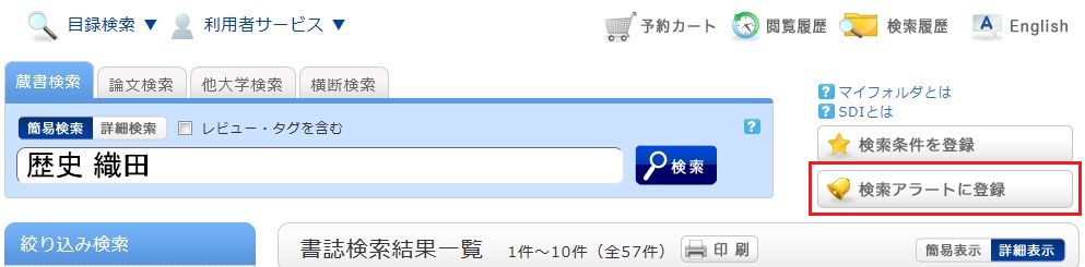 ヒット数が多すぎる場合は、検索結果一覧画面の左側に表示される「絞り込み検索」メニューの「分類」の項目から絞り込むことが可能です。分類の他に、資料種別・所蔵館・著者名・出版年・分類・件名・出版者・言語などでも絞り込みが可能です。