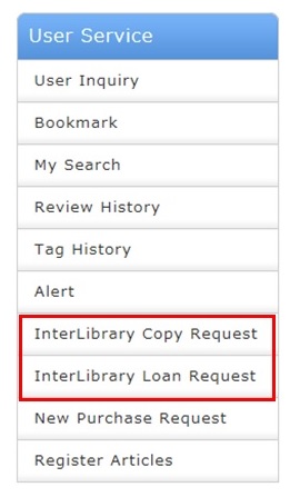 select the [Other Univ.] tab from the search bar. Select ILL Copy Request from the detailed pages (NII bibliography details screen) of that serial.