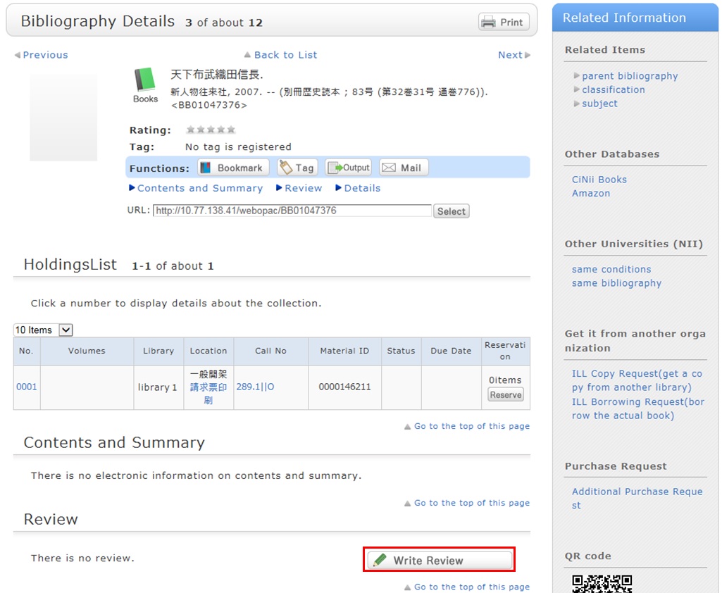 - Click "Book Management" on the bibliography search result list screen or bibliography details screen.