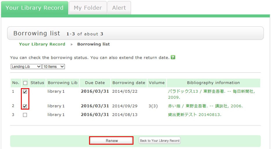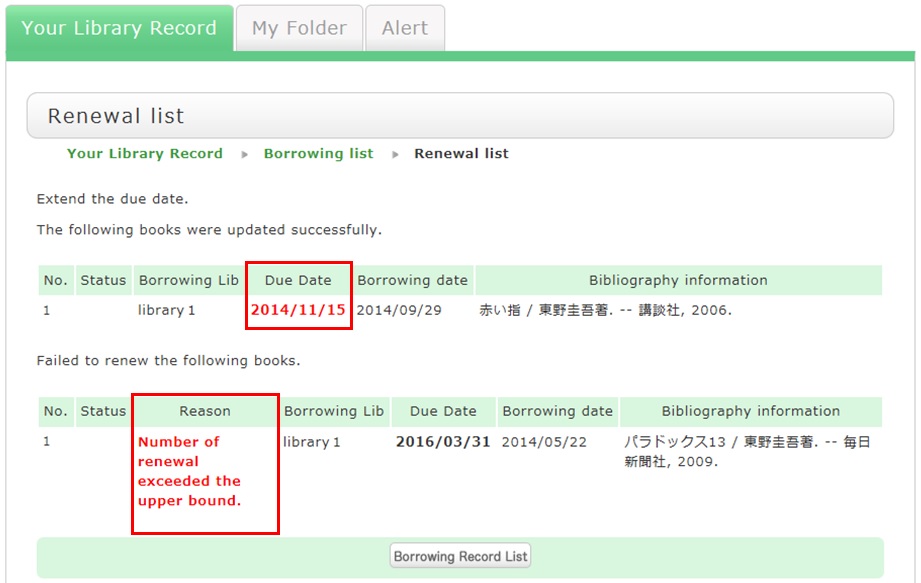 Note that the borrowing period cannot be extended for graduates and people outside the university. To get an extension, visit the library before the return due date arrives, and follow the extension procedure.